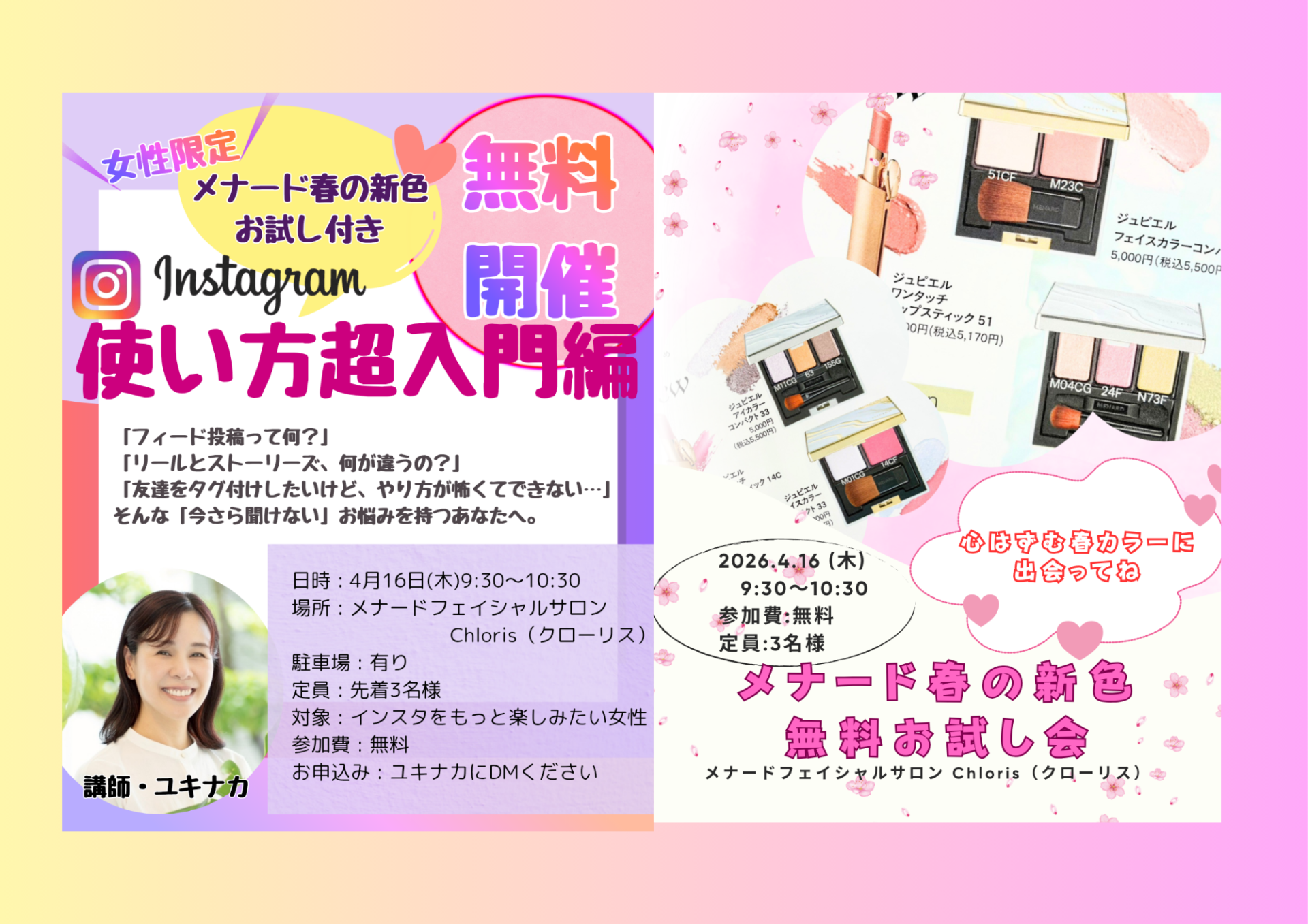 参加費: 無料(春の新色お試し特典付き!)